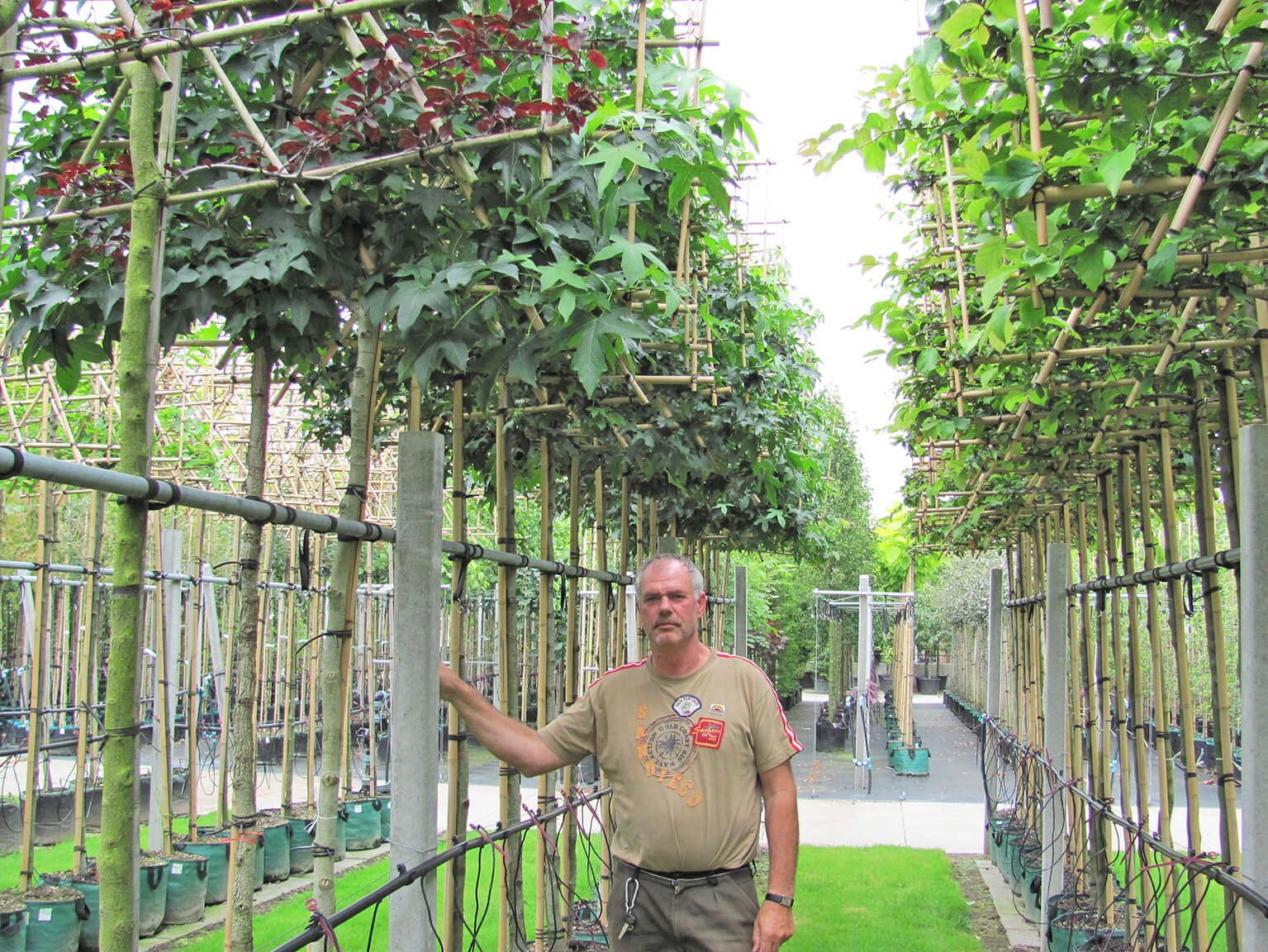 Ons bedrijf van 20 ha heeft twee specialisaties: de sierbomenteelt in de volle grond en de containerteelt. In de containerteelt hebben we ons ook gespecialiseerd in de vormbomen. We kunnen veel verschillende leivormen maken. Zo hebben we een breed sortiment van zeer uniforme bomen. Nu is het leverseizoen aangebroken en staan er heel veel bomen met pot- of draadkluit klaar om van eigenaar te verwisselen. Op enkele velden staan enten en stammen in een 3 tot 7,5 liter pot klaar om opgekweekt te worden, om daarna in de volle grond te worden opgeplant. Laanbomen worden twee- of driemaal verplant. Drie maal verplantte bomen staan vaak eerst een jaar in een pot, daarna drie jaar in de volle grond en worden dan nog een keer verplant. Dat geeft dikkere bomen met een stamdikte van 14-16 tot 20-25 cm. Ons sortiment bestaat uit ongeveer 150 soorten bomen. Eerst waren dat er wel meer, maar dat leverde jammer genoeg niet genoeg op.